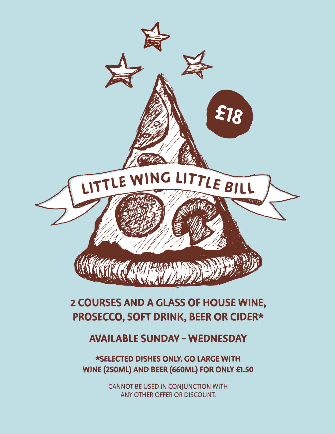 2x courses and a choice of drink for £18 - available at all Little Wings Pizzerias