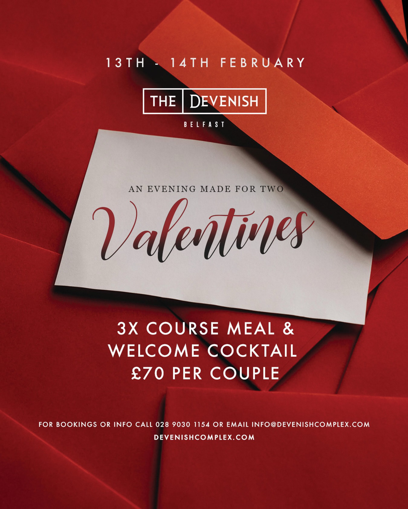 Book your table now by calling 028 9030 1154 or emailing info@devenishcomplex.com