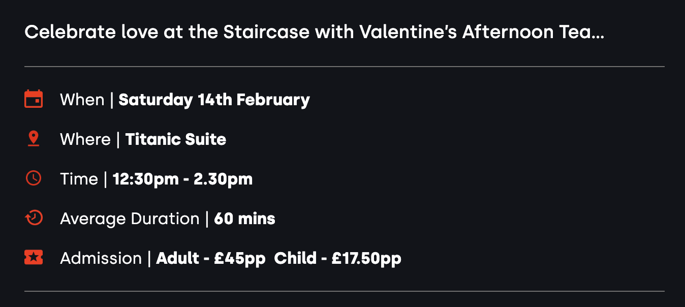 Step into a world of luxury and indulgence this Valentine’s Day with their Afternoon Tea, set against the opulent backdrop of the Titanic Suite. Admire the stunning Grand Staircase, soak up the ambiance, and enjoy live music as you celebrate love in style.